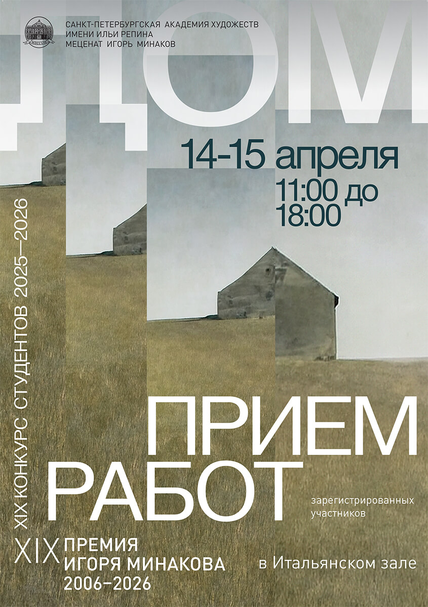 Конкурсная выставка «Дом» будет работать с 17 по 30 апреля в Итальянском зале СПб Академии художеств имени Репина (19, 26 апреля — выходные дни). В основных номинациях конкурса определят лауреатов премий мецената Игоря Минакова.